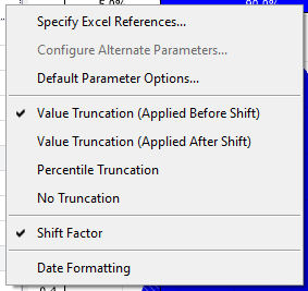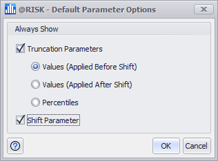 Default Parameter Options - The options to always display Truncation Parameters and Shift Parameters (see below) can be set in the Default Parameter Options window (Figure 3, right). When selecting to always display Truncation Parameters, Values (Applied Before Shift), Values (Applied After Shift), or Percentiles can be selected.