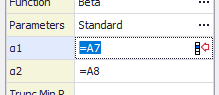 After clicking Specify Excel References, click and drag to select contiguous cells; when selecting contiguous cells, the first cell selected will be used for the distribution's first parameter, the second cell selected will be used for the second parameter, and so on.