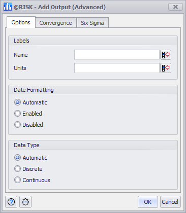 When the Data Type option is set to 'Automatic', @RISK will use the results of a simulation to determine if an Output is discrete or continuous; this affects the graph that is generated for the Output. This behavior can be overridden by manually setting the Output to either 'Discrete' or 'Continuous' as appropriate.