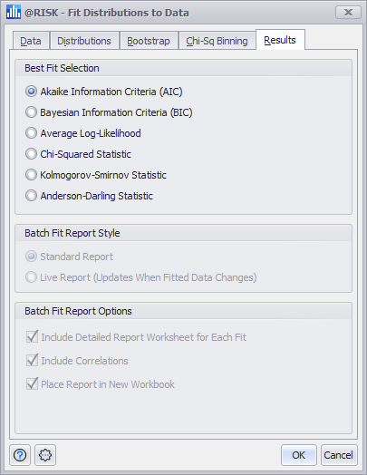When running a Batch Fit, this setting determines the type of report @RISK will generate. A Standard report will be generated at the time the fit is run, and will not update until the fitting configuration is modified and the fitting process rerun. A Live Report will update when the data set being used for the fitting changes.