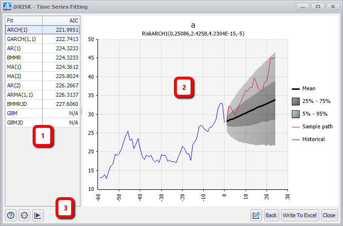 The selected @RISK time series model function will be displayed below the graph name, including the parameters required to produce data similar to the data set used in the fit. The graph will display the data used in the fitting process as a blue line (historical data), the sample path of the fitted time series model as a red line, and the percentiles of the distribution as gray areas representing the possible range of values. Depending on the configuration of the fitting process, the projected data will either begin alongside the historical data (when the option 'Series' Starting Point' is set to 'First Value of Dataset') or at the end of the historical data (when the option 'Series' Starting Point' is set to 'Last Value of Dataset').