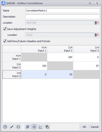 Adjustment weights can be used when there is a degree of confidence in the correlation between specific inputs and @RISK should not be able to modify those correlation values. Adjustment weight values range from 0 (zero) to 100, where zero designates that any changes are allowed (i.e. the lowest importance) and 100 designates that no changes are allowed (i.e. the highest importance).