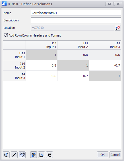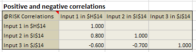 In some circumstances, @RISK may use a text value located several rows or columns away from the selected input; these values cannot be edited in the Define Correlation window. If incorrect values are being used and formatting of the correlation matrix is necessary, it is recommended that either manual formatting is applied to the header cells, or the inputs included in the matrix are named appropriately.