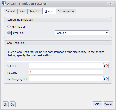 This option enables a model to utilize an Excel tool such as Goal Seek or Evolver during each iteration of a simulation. Typically, an Excel Tool is used when the values sampled by @RISK should be used in a goal seek or optimization model. During each iteration, @RISK will run the selected tool and incorporate the calculated results from the tool into the simulation outputs.