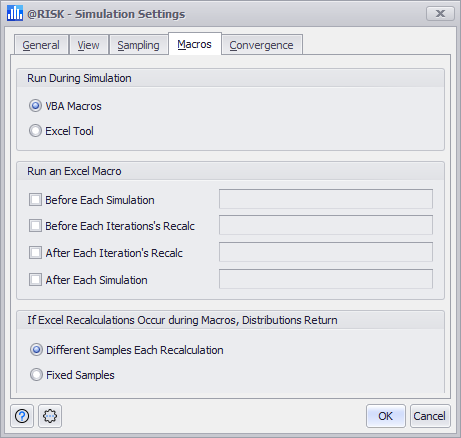 The Macros settings tab (Figure 1 and 2, below) allows for the configuration to either run macros during a simulation or to run an Excel Tool during each iteration of a simulation. There are two layouts of the Macros tab, each with its own set of options - one for VBA Macros (Figure 1) and another for Excel Tools (Figure 2).