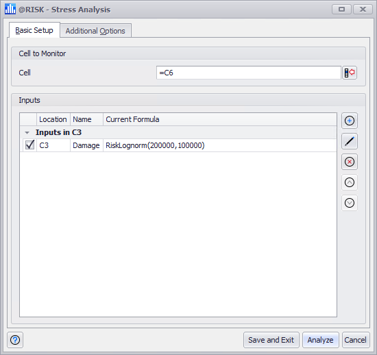 The Stress Analysis command of the Simulation menu will run an analysis of the effects of stressing @RISK distributions. “Stressing” a distribution restricts samples drawn from the distribution to values between a specified pair of percentiles (e.g. only values that fall between the 30th and 60th percentiles). Alternatively, stressing can be done by specifying a new “stress” distribution that will be sampled instead of the original distribution in a model. With Stress Analysis a number of @RISK distributions can be selected simultaneously and simulations run while stressing these distributions jointly - either in one simulation, or separately in multiple simulations. By stressing the selected distributions, analysis of scenarios can be done without changing the overall model.