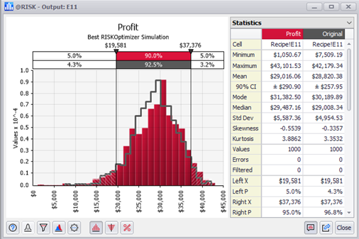 While an optimization is running, RISKOptimizer will improve distributions of values. This is illustrated in the Browse Results window both during and after an optimization (Figure 1, right). The Browse Results window shows the distribution of values for the target cell both before and after the optimization. The original distribution of values is illustrated by the grey line graph and in the Statistics window (if selected) under the "Original" column. The best distribution found is illustrated in red (both in the graph and in the Statistics column).