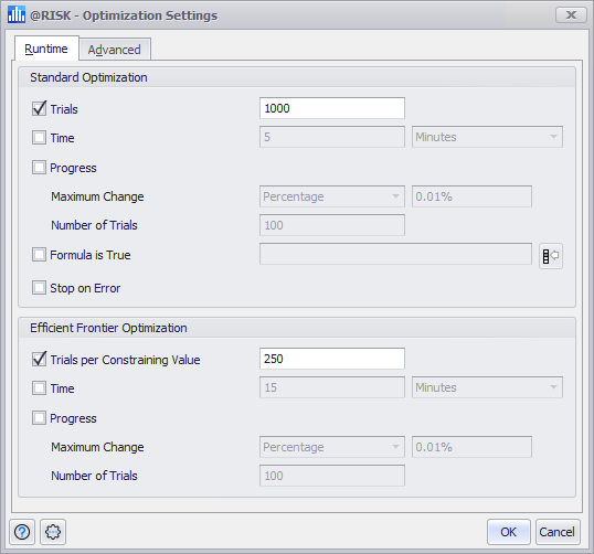 - Trials – When this option is set, RISKOptimizer stops when the given number of trial simulations have been performed.