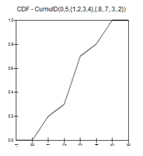 RiskCumul(0,10,{1,5,9},{0.1,0.7,0.9}) returns a cumulative curve with 3 data points and a range of 0 to 10. The first point on the curve is 1 with a cumulative probability of 0.1 (10% of the distribution values are less than or equal to 1, 90% are greater). The second point on the curve is 5 with a cumulative probability 0.7 (70% of the distribution values are less than or equal to 5, 30% are greater). The third point on the curve is 9 with a cumulative probability of 0.9 (90% of the distribution values are less than or equal to 9, 10% are greater). RiskCumul(100,200,A1:C1,A2:C2) returns a cumulative distribution with 3 data points and a range of 100 to 200. Cells A1 through C1 hold the values of each data point, and cells A2 through C2 hold the cumulative probabilities. Note that curly braces are not required when cell ranges are used as entries to the function.