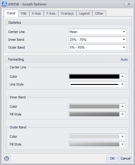 The Statistics group defines which statistics will be used to determine the center line (either the mean, median, or mode) as well as the boundaries of the inner and outer band of the trend graph.