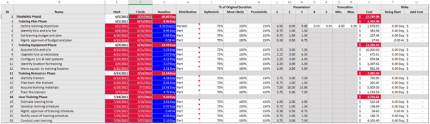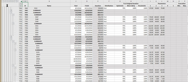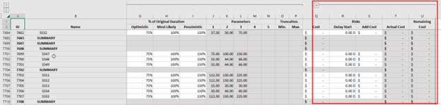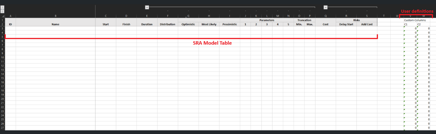 For both the Clear and Replace Schedule options, the SRA Model worksheet will keep the SRA Model table headers, user definitions in columns to the right, and additional worksheets the user defines. Users could import any project to this workbook and adapt their Excel definitions to the new project.