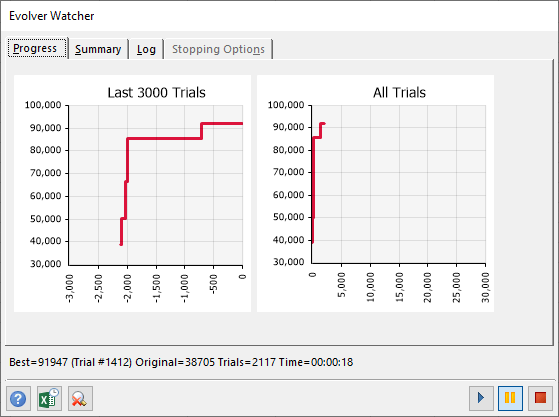 The magnifying glass icon on the Evolver Progress window displays the Evolver Watcher (Figure 1, right). Evolver Watcher is responsible for regulating and reporting on all Evolver activity. From Evolver Watcher, the progress of the optimization can be monitored and parameters changed; additionally, real-time information about the problem and detailed information on Evolver’s progress is available.