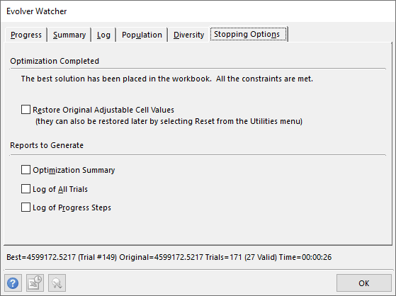 When an optimization completes due to stopping conditions, or the Stop button is clicked, the Stopping Options tab is activated. This tab includes the options available for updating the Excel worksheet with the best calculated values for adjustable cells, restoring original values, and generating various summary reports.